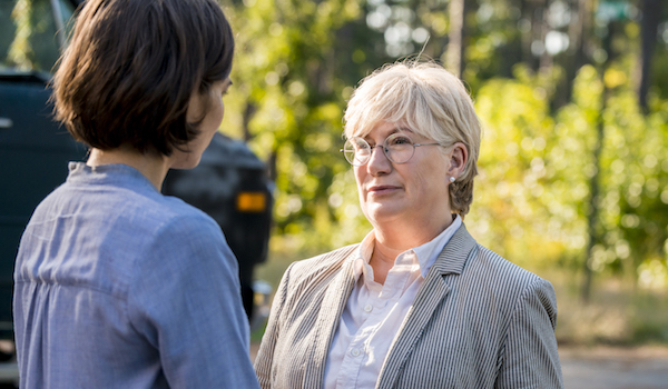 When I brought up how Walking Dead fans will likely hold Georgie up on a distinct pedestal after watching her introduction, Atkinson said she heard that sentiment several times when she was on the set. At first, she wasn't aware of the full extent of how lovingly obsessive people can be, but she's now fully invested in embracing the fandom. (She compared her son's Walking Dead parties to the 24 parties fans would have in that show's heyday.) As it was previously hinted at, there may be longevity to the role that wasn't directly expressed in the episode, and our first clue came when Georgie wasn't killed off. After I expressed my delight in her survival, Jayne Atkinson laughed and mentioned how the lack of traditional Walking Dead action in Georgie's scenes informed her decision to take the role.