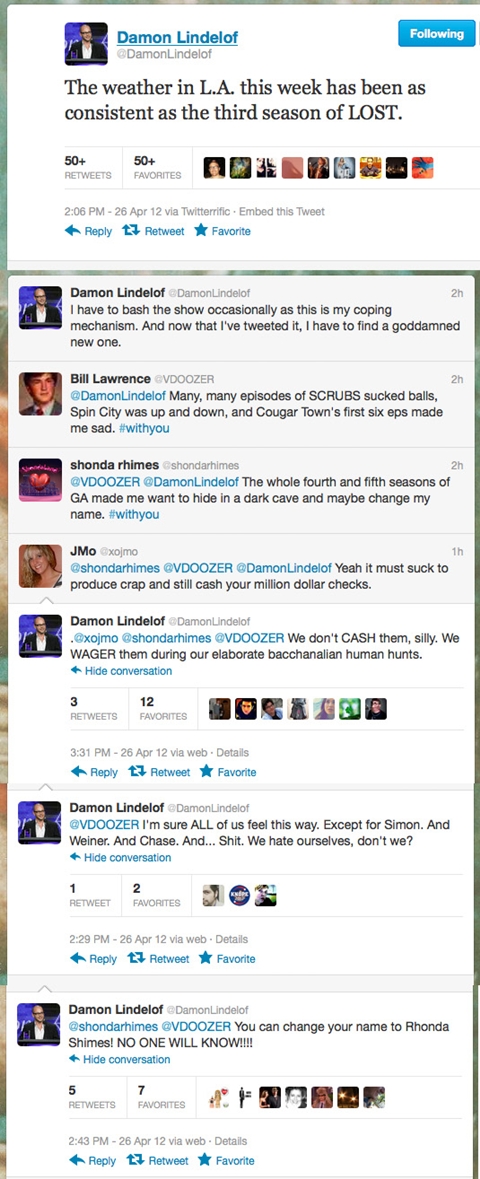 Lindelof's good-natured dig at his own show apparently resonated quite a bit with some of his fellow show creators. Soon both Bill "Scrubs" Lawrence and Shonda "Grey's Anatomy" Rhimes weighed in with their own regrets about shows that didn't work, or didn't work as well as they could have. You can check out some of the back-and-forth in the image below. And hey, now we know how Lindelof spends all that filthy Lost lucre!